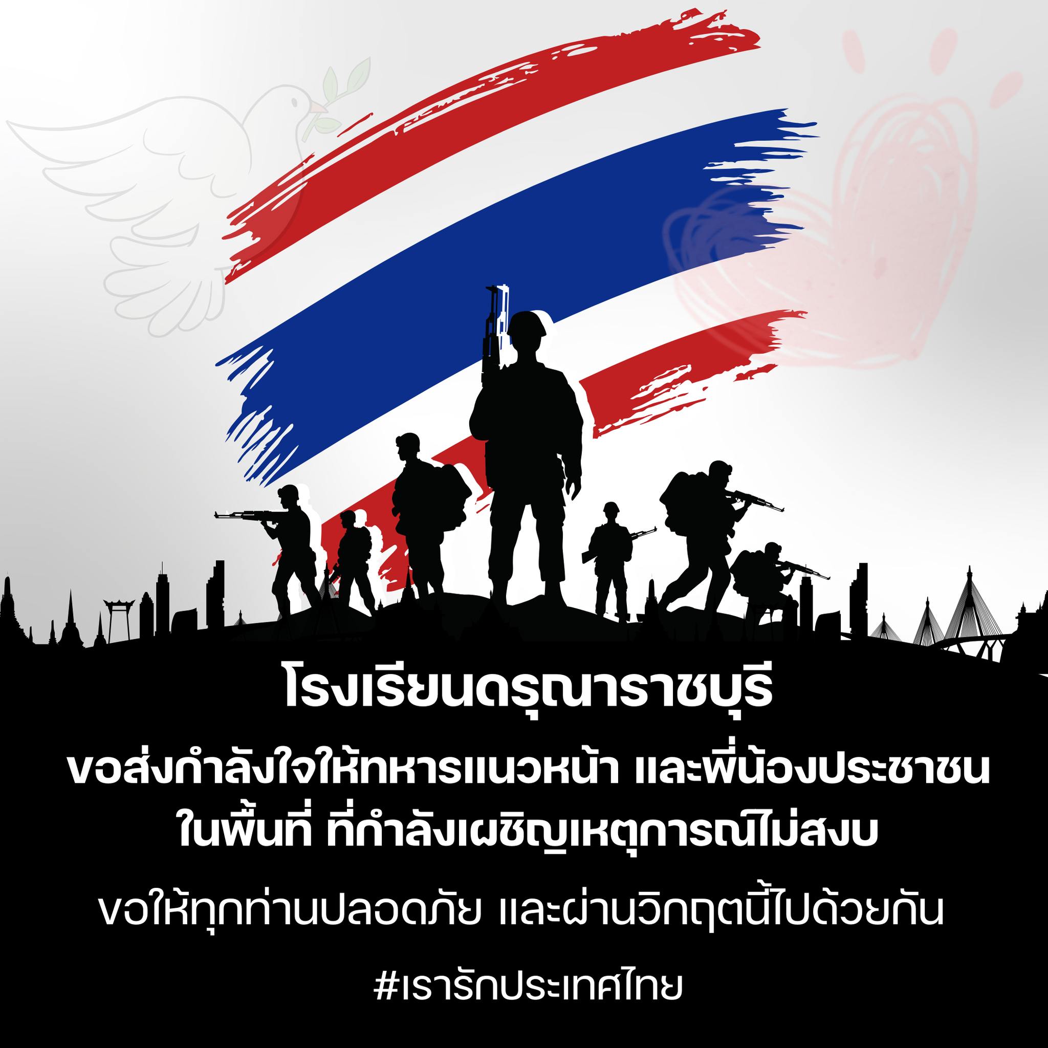 โรงเรียนดรุณาราชบุรี ขอส่งกำลังใจให้ทหารแนวหน้า และพี่น้องประชาชนในพื้นที่ ที่กำลังเผชิญเหตุการณ์ไม่สงบ ขอให้ทุกท่านปลอดภัย และผ่านวิกฤตนี้ไปด้วยกัน เรารักประเทศไทย